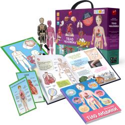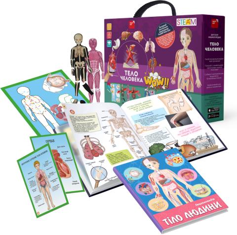 Набор включает в себя: Книга "Тело человека", пазлы скелета, мышц, внутренних органов, пазлы глаза, большие карточки Edu с AR-анимацией.