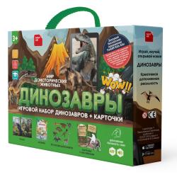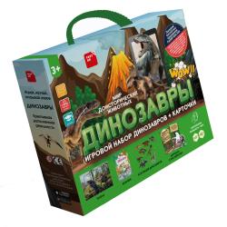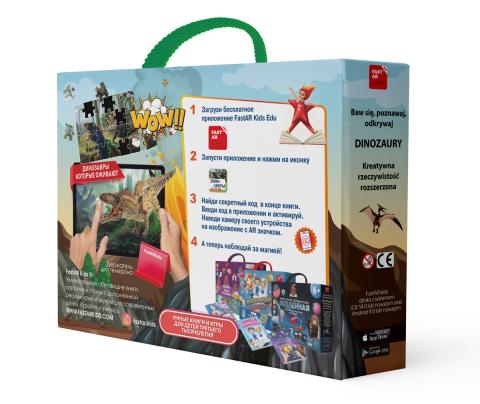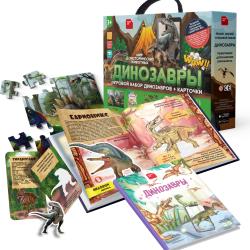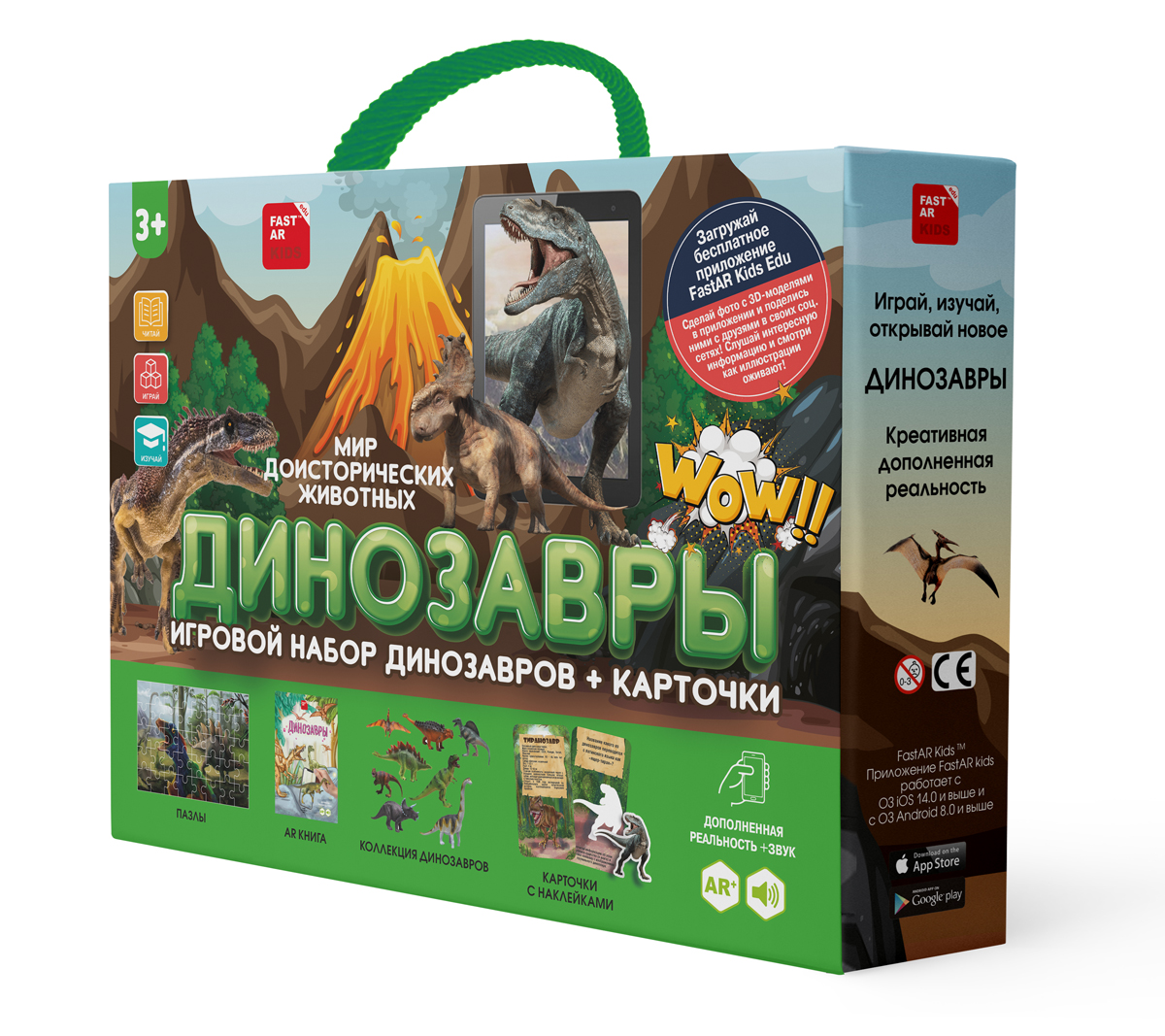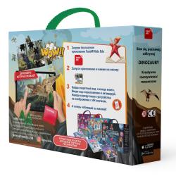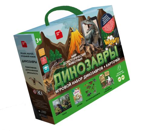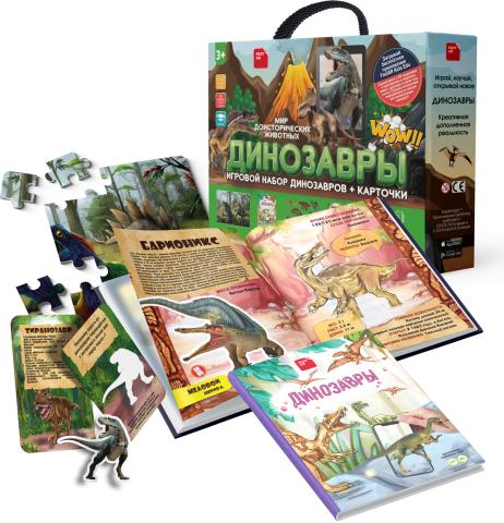 Этот набор включает в себя: 12шт 3D моделей (игрушек) животных, книга с дополненной реальностью, которая оживляет этих существ, пазлы динозавров, карточки с вопросами викторины (18 шт.) и наклейки дино.